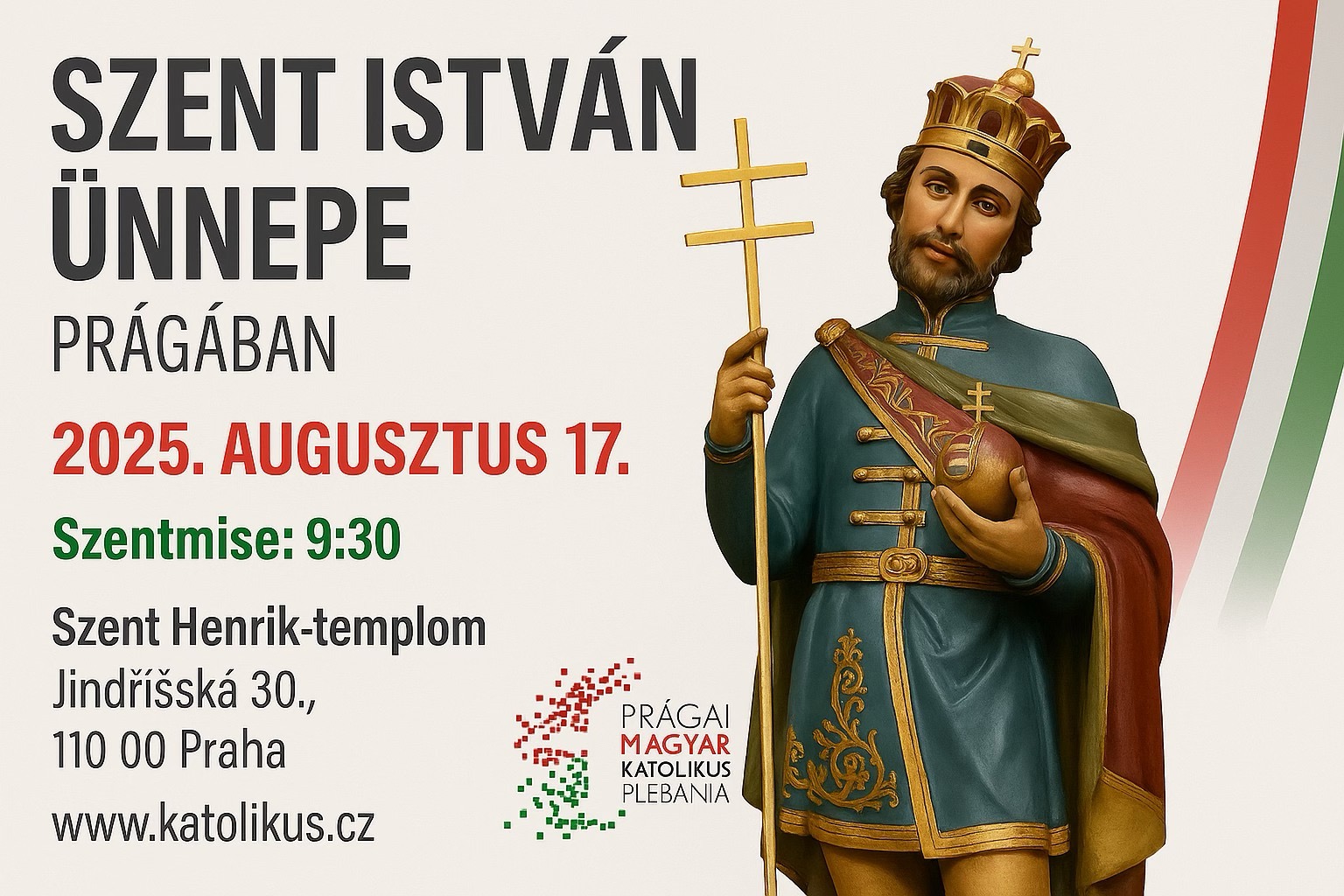A Prágai Magyar Katolikus Plébánia közössége tisztelettel és szeretettel meghívja az érdeklődőket 2025. augusztus 17-én, vasárnap 9:30 órakor kezdődő ünnepi szentmisére, melynek keretében Szent István királyunkra, a magyar államalapítóra emlékezünk.A szentmise során megáldjuk az új kenyeret, majd szeretettel hívjuk vendégeinket egy baráti agapéra a plébánia kertjében.