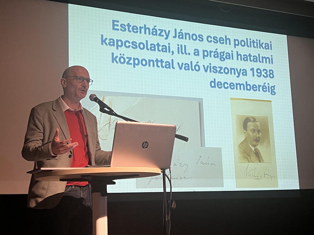 Andrej Tóth előadása Esterházy prágai parlamenti tevékenységére, tárgyalásaira és cseh kapcsolataira világított rá. Részletesen bemutatta parlamenti felszólalásait, politikai szerepvállalását, valamint prágai tartózkodásának helyszíneit is. Előadását hiteles fotódokumentumokkal, levelezésekkel és korabeli feljegyzésekkel gazdagította, így számos érdekes történelmi adattal és összefüggéssel közelebb hozta Esterházy személyét és korát a hallgatósághoz.
